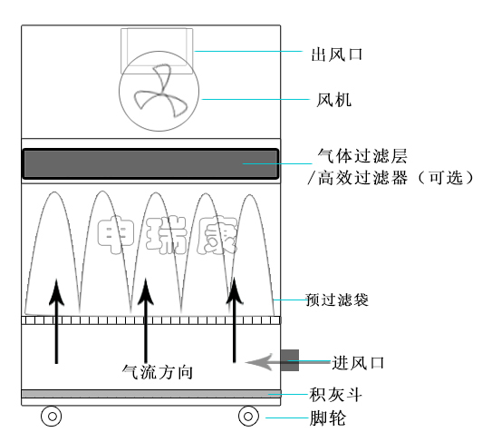5.倒置進(jìn)風(fēng)設(shè)計,袋式過濾,大顆粒粉塵會沉降至底部積灰斗,最大程度增加了容塵量。